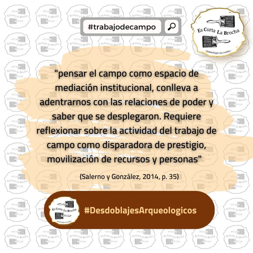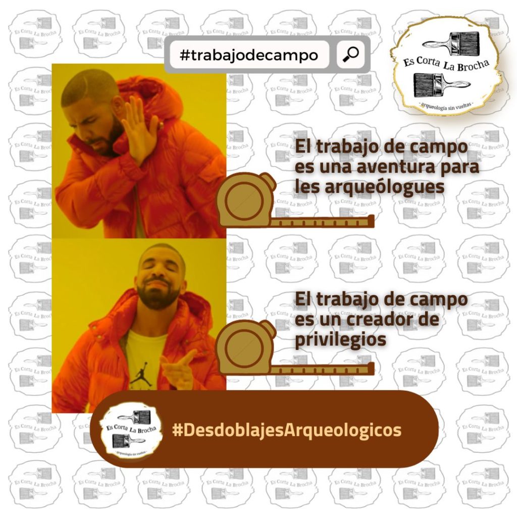 Por otra parte, romper con el relato épico de la aventura también implica, en mi opinión, reconocer los privilegios relacionados al trabajo de campo. “¿Qué privilegios?” preguntarán algunes, pues bien, me refiero a los privilegios de ? agarrar la pala ? por más que no se toque una pala ni de lejos y hasta se la considere una herramienta despreciable (hay de todo en la viña de la arqueología). El privilegio al que me refiero surge del reconocimiento sobre el trabajo de campo como actividad en la que les arqueólogues desplegan sus plumas teórico-prácticas, porque en el trabajo de campo se condensan saberes específicos que, sin que necesariamente sean comprendidos, sí son identificados por terceros. Casi como un diacrítico.